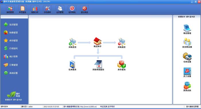 绿叶手机进销通管理系统是一款专业的手机进销通系统,其中包含手机进货及销售系统,手机库存管理系统,财务和报表系统等子模块。绿叶手机进销通系统界面简洁优美,操作直观简单,无需专门培训。提供单机版、网络版、远程版以适应用户的不同需求。支持手机串号管理及查询功能。绿叶手机管理软件广泛适用于手机销售店,手机卖场等用于手机销售管理,手机库存管理,手机店内部的客户管理,员工管理等场合,是您企业进行信息化管理的理想工具。